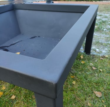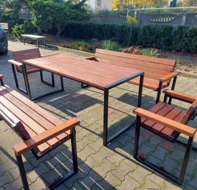 Zestaw wykonany z profili 6x3 malowanych proszkowo oraz solidnej deski olchowej o grubości 3cm. Długość stołu, ławek do ustalenia indywidulanego