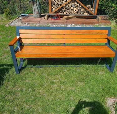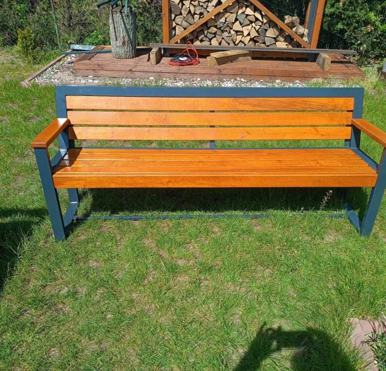 Wygodna ławka do ogrodu lub przestrzeni publicznej z solidnych profili 6x3 malowanych proszkowo, deska olchowa dwukrotnie malowana farbą lasurową oraz olejem