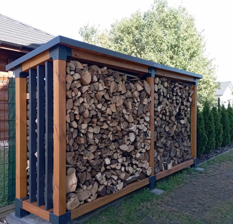 Stylowa drewutnia wykonana z belek sosnowych 9x9 szlifowanych, malowanych dwukrotnie. Łączniki wykonane z profili 10x10 malowane proszkowo. Wymiary do uzgodnienia według potrzeb klienta