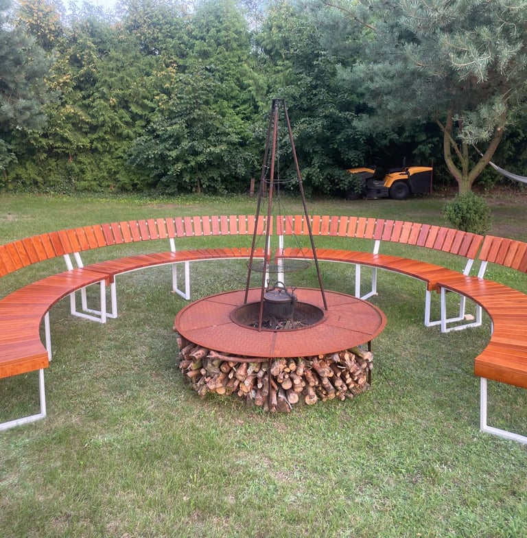 Ławka łukowa 2m wykonana z profili 4x2 malowanych proszkowo oraz deski olchowej 7,5x40 cm malowanej farbą lasurową oraz olejem wysokiej jakości. Promień ławki ustalamy z klientem